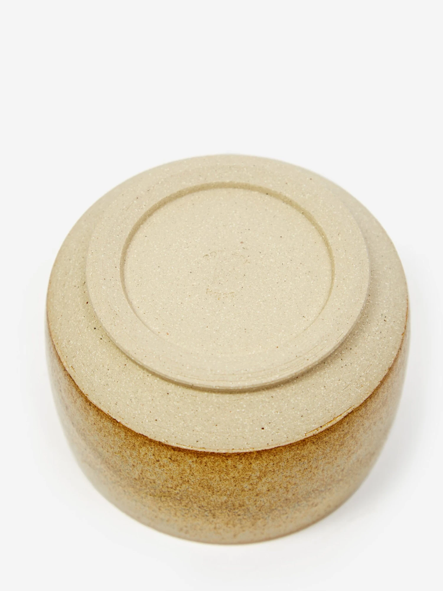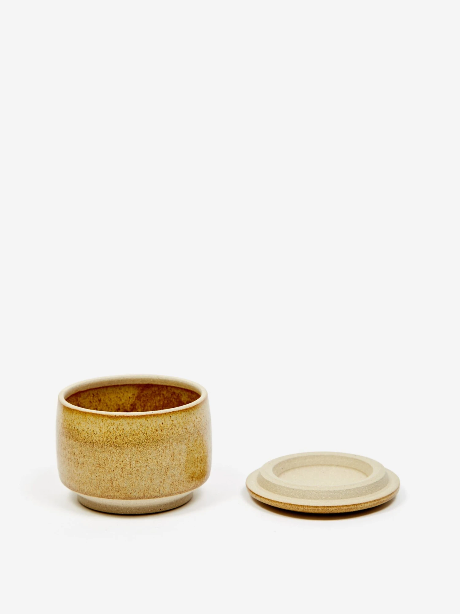 This small, simple Pottery West jar is handmade in a rich ochre glazed stoneware. It is topped with a sleek, handleless lid.